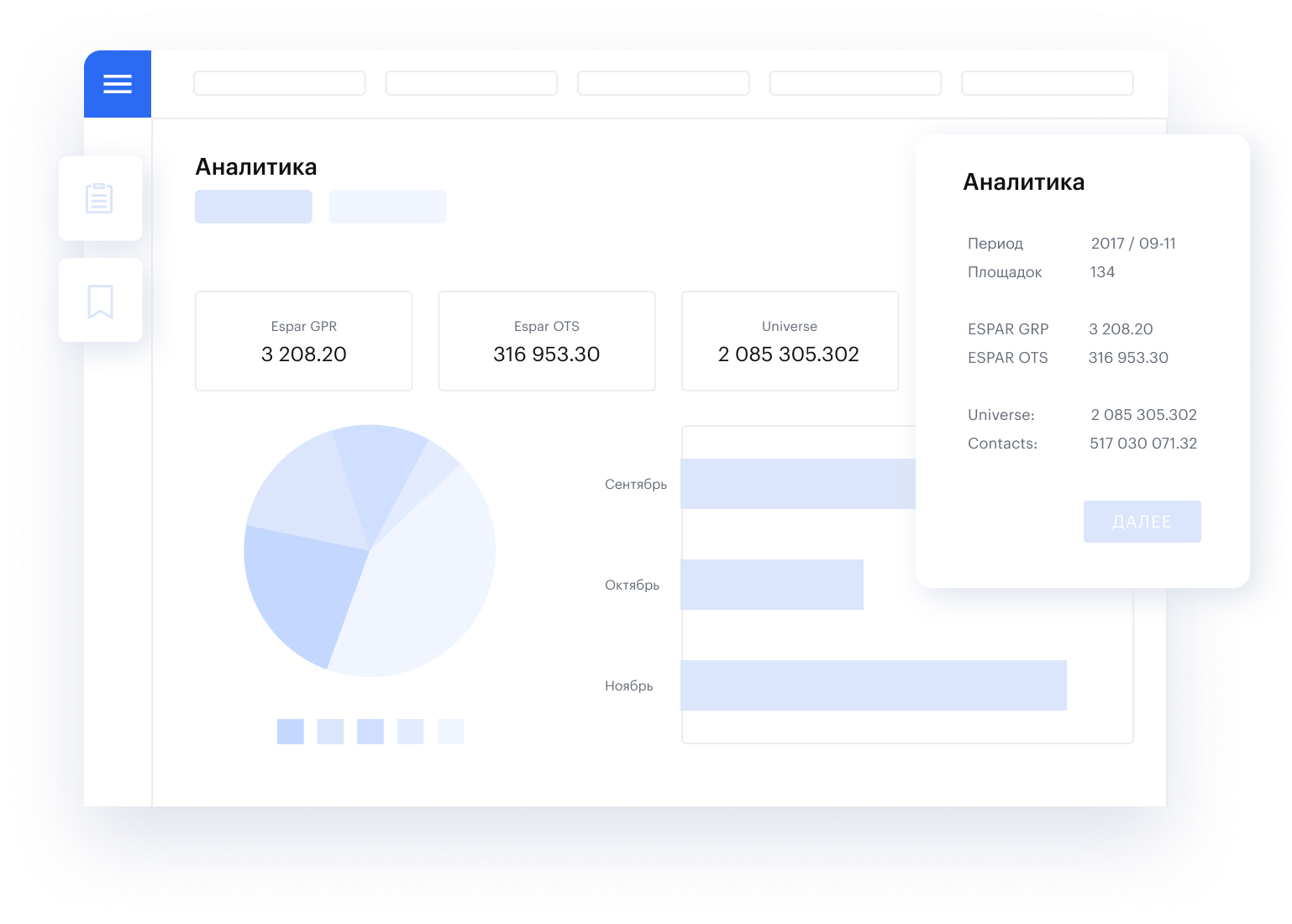 Система дашбордов поможет оперативно проанализировать ситуацию. Медиаметрию собираем на основе ESPAR, но готовы интегрировать вашего поставщика данных.